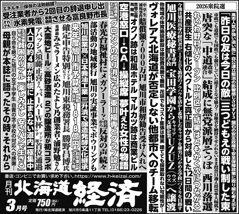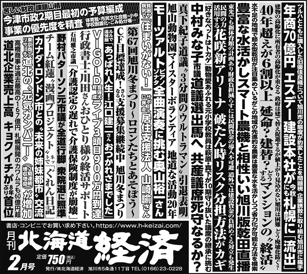多くの自治体が企業誘致に力を入れる。旭川市も例外ではなく、あの手この手でこの地域の魅力をアピールしながら、本州から大手企業の誘致に成功、雇用機会や税収の確保につなげている。ところが、民間の施主から旭川市内・市外で多くの工事を受注している㈱エスデー建設(古林幹弘社長)が、今年秋にも本社を旭川市豊岡4条5丁目から札幌新琴似に移す。4年前に1億円以上で購入した旧優佳良織3館の土地と建物の再開発について、旭川市が事前に提示したプランの実現に必要な支援が得られないのが大きな問題。広大な土地については自主的な開発を見送った。旭川市から札幌圏への企業流失の流れは今に始まったことではないが、今回のようなケースは前代未聞。旭川市は「事業者側との交渉はま... -